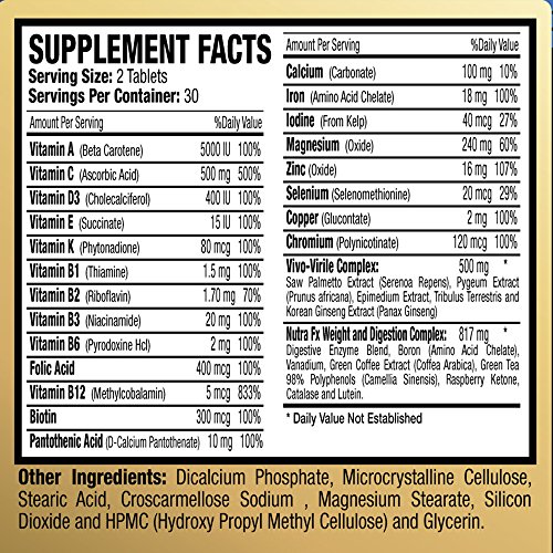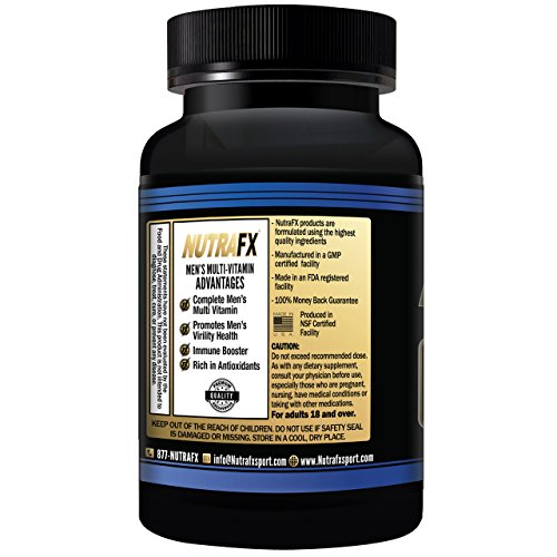 -. Feature : BOOSTS FITNESS GOALS - Nutrafx multivitamins for men boosts your fitness goals as well as improves muscle recovery. Our bodybuilding supplements are formulated specifically for your nutritional demands to help fine-tune your fitness goals without compromise. They help your endurance, circulation, recovery, muscle repair and muscle growth. / PROMOTES ENERGY AND VIRILITY - Your energy levels will increase to support your active lifestyle so your get-up-and-go energy is back. Slishness disappears and your spirits elevate to keep you moving throughout the day with ease. Our supplements support the health of your male virility so you feel like yourself again! / INCREASES OVERALL HEALTH - Our multivitamins are designed specifically for the nutritional needs of active men. You get the highest quality ingredients which include 21 essential vitamins and minerals along with 13 additional ingredients to support your overall health. It supports your immune system, defends against cell damage, relieves your stress, and enhances the digestion of all the nutrients you take in. / MADE IN USA AND SAFE - You have peace of mind knowing our multivitamin supplements are proudly made in the USA in our own state of the art cGMP and NSF certified facility under strict FDA guidelines. Plus, these easy to swallow multivitamins leave no aftertaste, will not upset your stomach, and have no side effects. And, you only take 2 tablets each day preferably with a meal. / SATISFACTION GUARANTEED - Your overall health and well-being are as important to us as they are to you! That's why we offer a 100% money back guarantee if you're not completely satisfied. Simply let us know and we will promptly refund your money, no questions asked. For more information, please read the product description below.