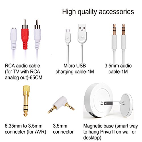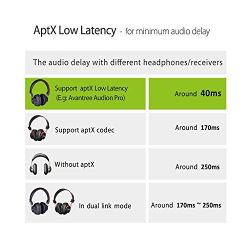 -. Feature : NO AUDIO DELAY - Priva II offers AptX LOW LATENCY support so you can enjoy TV wirelessly at next-to-none audio delay. (NOTE: To benefit the full Low Latency, you need to use it with a Low Latency supported Bluetooth receiver, such as Avantree Audition Pro, BackBeat Pro and more) / CHARGE FREE - It has battery mode and DC mode. You can power it up with TV USB (charge free) OR use the build-in battery for portability. / MULTIPOINT - You may stream audio to TWO RECEIVERS (two headphones or speakers) simultaneously. (NOTE: Due to Bluetooth technology limit, aptX Low Latency does NOT support Dual link mode) / UNIVERSAL COMPATIBILITY - It support TV, AVR, Amplifier, or any audio device with analogue audio output. The included RCA cable and aux cable help the connection easily. / WARRANTY & SUPPORT - For this technology product, we provide Video User Guide, Telephone, email and live chat support. We also support 12M warranty.