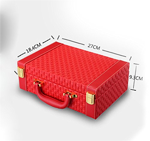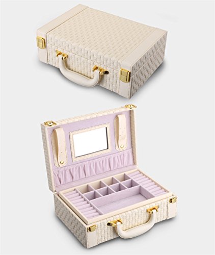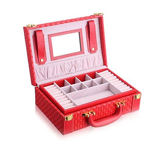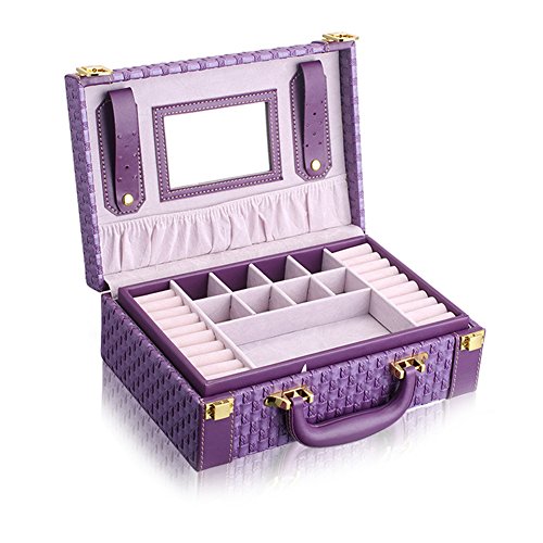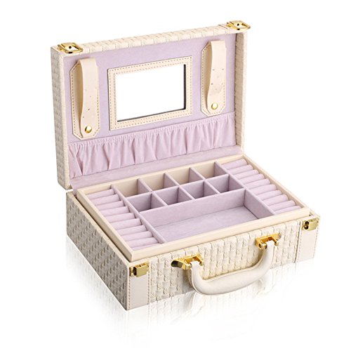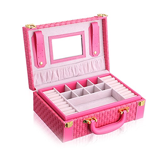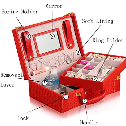 -. Feature : Good workmanship with high quality and Eco-friendly PU leather and velvet / Dimension: Approx.10.6x7.2x3.7" (27x18.4x9.3cm) / 2-layer caddy box small suitcase design allows you to store your jewelry separately within the box and keep them from colliding each other; Comes with a mirror to assit you when wearing the jewelry and make up / Large capacity portable jewelry storage box suitcase to carry and store your jewelry and some cosmetics; Perfect for those who has many jewelry and small items and travels a lot, like artist, stylist, fashion icon and so on. / Package include 1x Jewelry Storage Box only, the jewelry are for display and not included