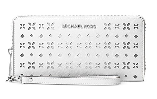 -. Feature : Floral perforated Saffiano leather; lining: polyester / Zip-around closure / 1 interior zip pocket, 3 inner pockets & 16 card holders / 6"L detachable wrist strap / 8-1/4"W x 4"H x 1"D