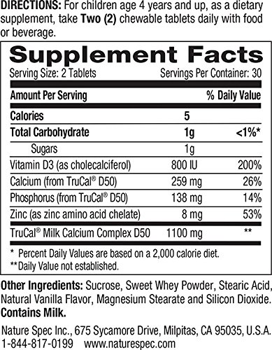 Nature Spec Kid’s Chewable Milk Calcium + Vitamin D3 formula contains high quality TruCal®milk calcium, it has the correct balance of minerals required for maximum bone growth and maintenance.