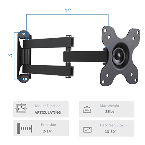 -. Binding : Wireless Phone Accessory -. Brand : WALI -. Color : BLACK -. EAN : 0811278020498 -. Feature : Compatible with VESA (mounting hole pattern) 75x75mm(3"x3") or 100x100mm(4"x4") for Most 13" 15" 17" 19" 20" 22" 23" 24" 26" 27" LED TV Flat Panel Screen / Design places TV just 2 inches from the wall to enhance the look of ultra-thin LED TVs / Adjustable +/-15 degrees tilt; 180 degrees swivel and 360 degrees rotate.Extends up to 14" from the wall / Mounting hardware is included for mounting to wooden studs, concrete and brick surfaces. / Post-installation leveling adjustments allow TV to be perfectly positioned after hanging. High grade steel material offers loading capacity to 33lbs -. Label : WALI -. Manufacturer : WALI -. Model : WL-1330LM -. MPN : WL-1330LM -. NumberOfItems : 1 -. PackageQuantity : 1 -. PartNumber : WL-1330LM -. ProductGroup : Speakers -. ProductTypeName : COMPUTER_ADD_ON -. Publisher : WALI -. Studio : WALI -. Title : WALI Articulating TV LCD Monitor Wall Mount Full Motion 14" Extension Arm Tilt Swivel for Most 13" 15" 17" 19" 20" 22" 23" 24" 26" 27" 30" LED TV Flat Panel Screen with VESA 100x100,75x75 WL-1330LM -. UPC : 811278020498