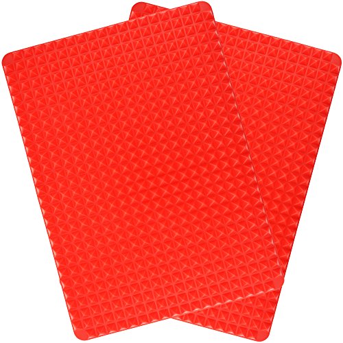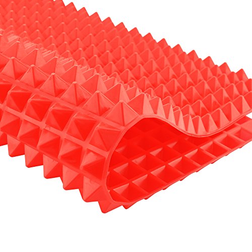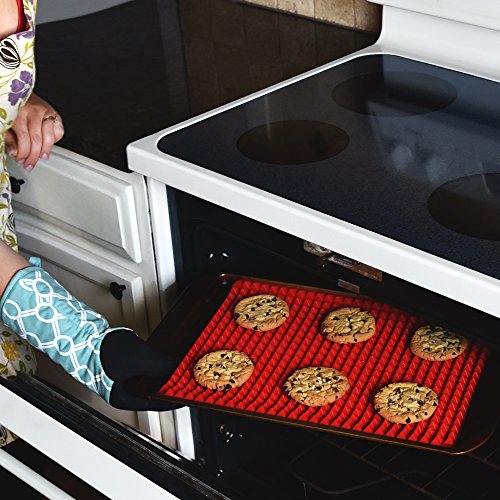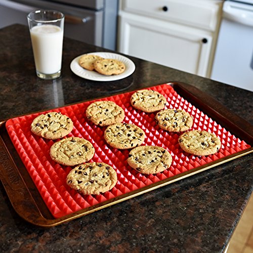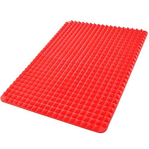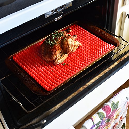 Nonstick, non-toxic BPA-free, this silicone baking mat features a raised surface for evenly cooked meals. Plus, grease fat drip away, giving you leaner meats. A must-have for any home cook. Love juicy, flavorful meat but hate the fat? Now you can enjoy the foods you love guilt-free thanks to the Silicone Baking Mat by Kitchen Addiction. It uses an innovative, pyramid-like surface to raise food above the pan. Grease fat drip away, leaving you with lighter, healthier meals. Plus, its raised design cooks food evenly. Now you can make crispy, breaded chicken tenders without the soggy mess. Enjoy All Your Tasty Favorites Reduced-fat meats are great, but your cooking mat can handle so much more. Use it to make: ? Ultra-tender potato skins ? Roasted veggies ? Hot, flaky salmon ? Crispy bacon Need to bake bread or dessert? Just flip it upside down for a flat, cookie-friendly surface. Not only that, it can double as a dish drying mat or trivet. Quality Made, Conveniently Designed Sold by an American company, every mat is thoroughly inspected to ensure the highest quality. Made of pure silicone, it's: ? Nonstick ? Non-toxic ? BPA-free Unlike other baking mats, it won't stain, rust or retain odor. Plus, the size is completely customizable. Trim it to fit roasting pans, toaster ovens more. It's even safe for convection ovens. Worried about sticking? Don't be. Food slides right off with a slight twist. When you're done, pop it in the dishwasher for easy cleaning, then roll it up for quick, space-saving storage. Add to Cart Now Going to a housewarming? Have a friend who loves to bake? Your new silicone bake mat is the perfect gift, so order for yourself a fellow chef today. 0 |