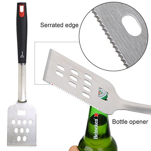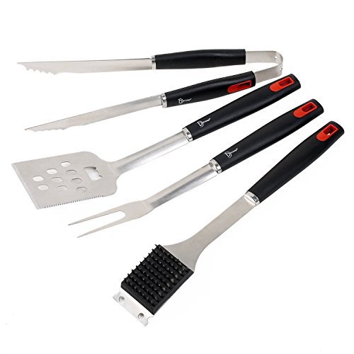 - 4-Piece Professional BBQ Accessories: This grilling utensils accessories completely contain a tongs, barbecue meat fork, silicone basting brush, and grilling spatula that features a bottle opener and serrated edge for tenderizing and cutting meat. No worry obout having never grilled before,It will help you to be or look like a master of the grill for its professional design.