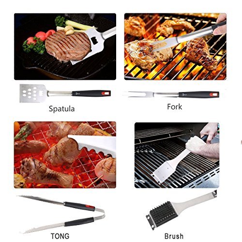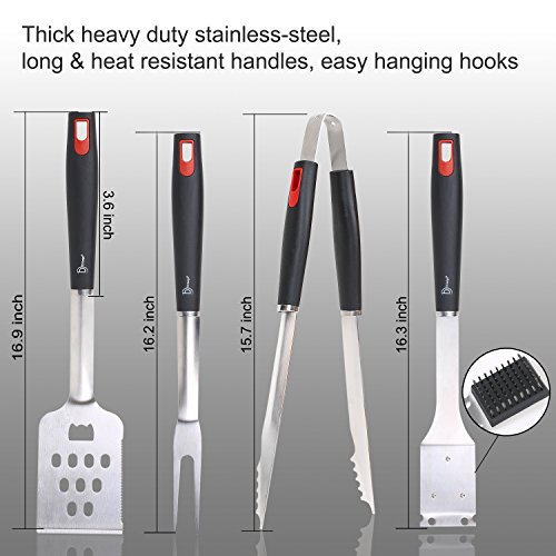 - .Heavy Duty Stainless-Steel Grill Tool Set : This grill utensils is made from professional grade heavy duty stainless-steel with long non-slip plastic grips which helps you conquer your food without grilling your hands. There will be no worry about your grill tools rusting, bending, or breaking again for its high quality.