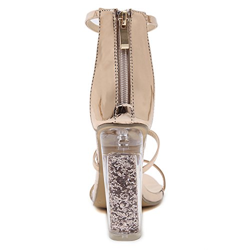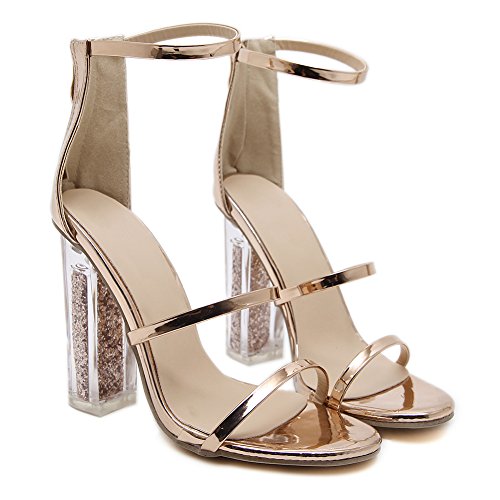 Product DescriptionWomen's Summer Sexy Fashion Transparent Block Chunky High Heels Ankle Strap Back Zipper Sandals Golden0