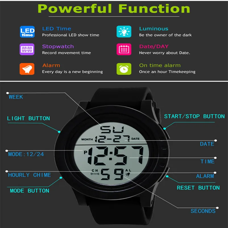 Feature:LED display,Fitness Tracker,Back Light,Complete Calendar,Alarm,Swim,Moon Phase