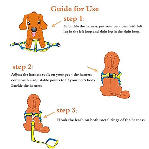 *Benefits: 1: This harness and leash is easy to wear,save your time before going out to have a great walk time with your pets. 2: Pet harness and leashes connect you and your pet, make you the master whether you are in waling, running, jogging or hiking. 3.Durable and comfortable fabric material to stop your pets get hurt when she or he runs suddenly,the considered design will make your pets with less pulling when you pull the leash,anyone with a crazy dog deserve it. 4: Various sizes and colors can be applicable for different size pets. 5.One pet rubber massage brush for free.
