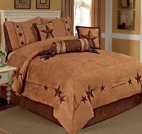 Product Description Bring a touch of class into your Bedroom with this Luxurious, 7 Piece Western Design Bedding Set. Accent Pillows are included. This bed in a bag set will add a touch of warmth and it will create a calm and relaxed atmosphere for your bedroom. Comforter sets are designed to keep you updated and fashionable in the most convenient and inexpensive way. Our comforter sets are a tremendous blend of bold and vibrant colors. They can transform a room from bleak to bright and cheery in a matter of minutes. Our comforter set will have your bedroom decorated with design. Turn your home into a haven with our beautiful comforter collection. Our comforters come in many sizes, including king comforters, queen comforters, and even California King comforter sets. We've included everything you need to make over your bedroom such as comforter, pillow shams, and bed skirts. Comforter sets are comfortable, durable and beautiful. Our comforter sets are designed for year around comfort. 0