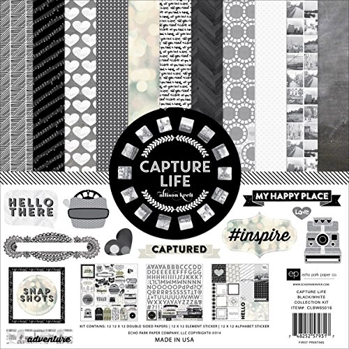 Echo Park Paper - Captured Life Black & White Collection Kit contains twelve 12x12 inch sheets of double-sided scrapbook paper, one 12 x 12 Element sticker and one 12 x 12 Alpha sticker. All pieces are acid and lignin free. Made in the USA.Feature