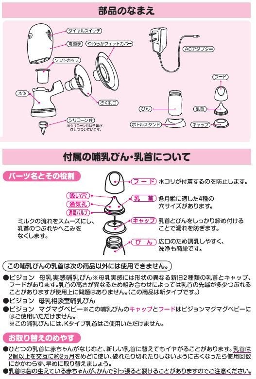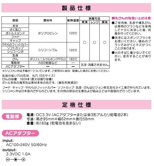 | 付属品 | 取扱説明書 保証書(保証期間1年) 母乳実感哺乳びん(プラスチック製・160ml) シリコーン弁予備×1 ACアダプター |