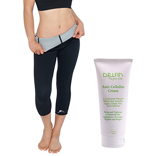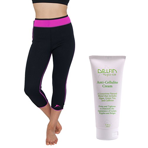 DELFIN HEAT MAXIMIZING CAPRIS are comprised of a thin layer of neoprene embedded with bio-ceramic material, which reflects body heat in the form of Far Infrared Rays (FIR). Soft nylon/lycra lining and soft elastic waistband; includes iPhone/phone pocket. Contoured design and ergonomically positioned flatlock seams to help reduce chafing and increase comfort. Use our capris as part of your daily exercise routine and we recommend for post-pregnancy. The primary benefits may include: improved microcirculation to help flush toxins, increased perspiration and calorie burning during exercise, and assistance in lessening fluid in fat cells which leads to more pronounced visible cellulite. When used in conjunction with our anti cellulite cream, it helps improve penetration and efficacy of the cream. Our capris tend to run big, so if you are in between sizes, choose the smaller size. It's best to measure yourself and compare to our size chart (see pic). Hip measurements listed in size drop down menu (inches). ANTI-CELLULITE CREAM: A formulated blend of natural ingredients to help firm and smooth the skin. Combination of natural extracts and ingredients include Algae, Green Tea and plant complexes. Results include visible reduction of lumps, ripples, and bulges. Light and pleasant fragrance that absorbs easily. Use in conjunction with our Heat Maximizing Capris or Shorts to improve the penetration and efficacy of the cream. Apply in the morning and at night in small portions. For external use only. If rash develops, discontinue use. Not tested on poor little animals! MADE IN USA.Feature
