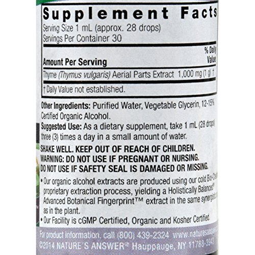 Organic Alcohol Extract (1:1) Thymus Vulgaris Herbal Supplement Holistically Balanced Since 1972 Kosher Parve Bio-Chelated Cold Extraction Process Natures Answer organic alcohol extracts are produced using alcohol, water and vegetable glycerin utilizing our cold Bio-Chelated proprietary extraction process, yielding a Holistically Balanced standardized extract. Liquid extracts are absorbed faster than tablets or capsules and are more potent than tinctures. Holistically Balanced guarantees that the constituents of the extract are in the same synergistic ratios as in the plant. Manufactured in our FDA registered and pharmaceutically licensed facility. 0 |