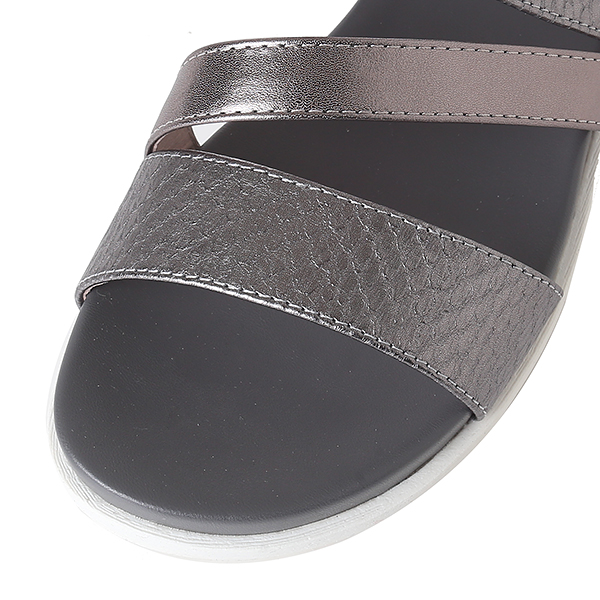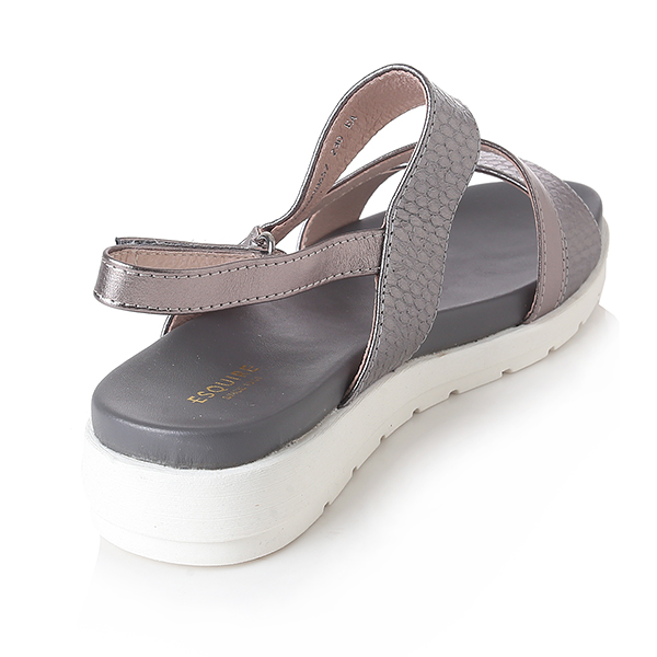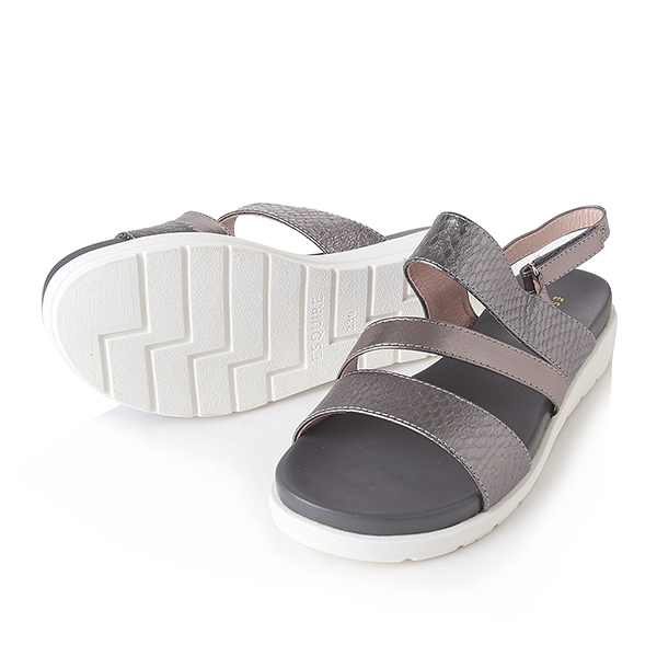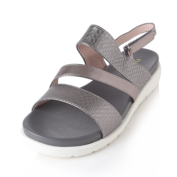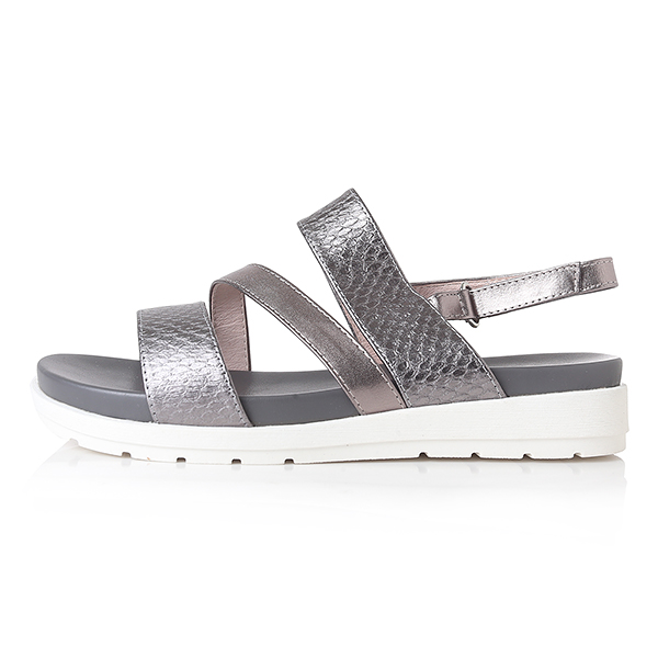 케주얼한 스타일의 메탈릭 샌들로 편안한 몰드창과 뱀무늬의 스트랩이 발을 편안하게 감싸줌. 뒤쪽의 벨크로 밴드는 조절이 가능함