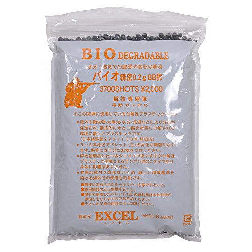 -. Feature : エクセルの競技専用バイオBB弾。 / 太陽光・空気・温度・微生物で、水と二酸化炭素に戻るバイオBB弾は、壌土への負担を軽減するので、屋外での使用に適しています。 / また、天然由来オリーブオイル成分が配合されており、自然環境に無害安全な材質を使用。 / エクセルのバイオBB弾は、特許を取得した自然腐敗する合成樹脂、バリウム、コーンスターチの、3つの主要原料によりできています。 / 特殊樹脂はBB弾の大半を占めており、バリウムはBB弾の重さを成し、コーンスターチは自然腐敗の活性剤の役割を担っている。