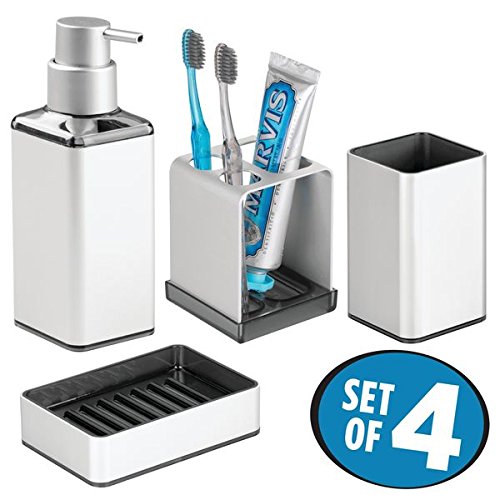 mDesign Rustproof Aluminum Bathroom Accessory Set, Toothbrush Holder, Soap Dispenser Pump, Tumbler, Soap Dish - Set of 4, Silver/Smoke
