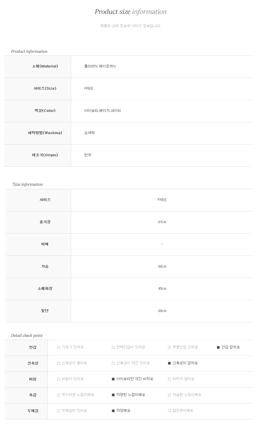 개인의 체형에 따라 핏이나 기장이 달라질수 있으니 사이즈표를 참고 해주세요.