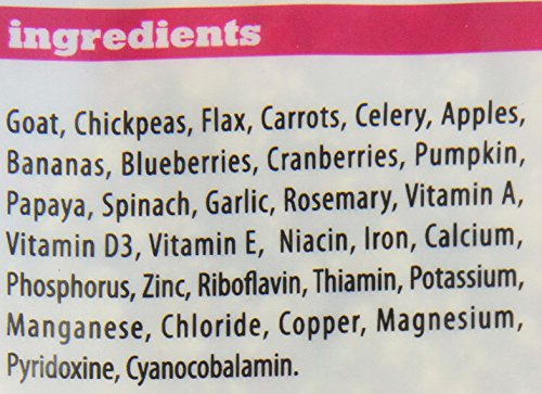 -. Feature : 3lbs bag contains USDA Goat, Chickpeas, Flax, Carrots, Celery, Apples, Bananas, Blueberries, Cranberries, Pumpkin, Papaya, Spinach, Garlic, Vitamins and Minerals / Exotic Protein - Great for dogs with Allergies / Made in our very own Family Owned and Operated Freeze Drying Facility in Southern California / High in Protein