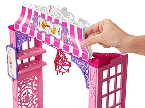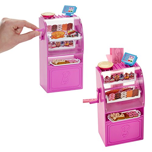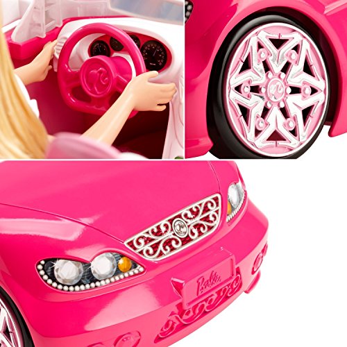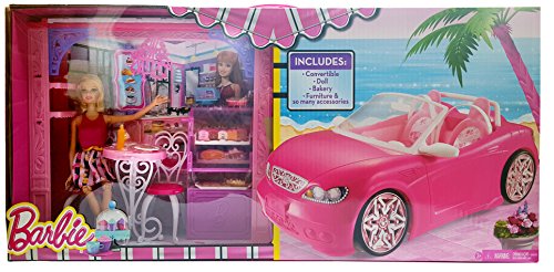 Barbie Life in the Dreamhouse is absolutely amazing, but Barbie doll also loves to get out and shop - some of her favorite spots are on Malibu Avenue, including the chic Bakery. Features a fabulous store frame with Barbie signature style and a Barbie doll in a fabulous fashion for playing out lots of fun stories. Large accessories are designed to display merchandise, complete services and check out, and each set has a unique feature. The Bakery features a spinning display case (simply crank the lever). Additional pieces permit complete play - Barbie doll can visit the Bakery that has a table and two chairs, the perfect spot to indulge in a treat at the bakery. Barbie doll (included) looks as sweet as the treats wearing a dress with sparkly pink bodice, yellow sash and skirt with floral and striped print; black shoes complete the chic shopper look. And of course, each shop also has lots of merchandise to allow for more storytelling fun! Plus, decorative grooves on some pieces hold smaller plug 'n play accessory items in place! Includes Barbie doll, shop frame, display unit, additional furniture, one register, a convertible, and multiple themed accessories. Ages 3 and older. Let cruise to the cafe in style with her Glam Convertible. The Barbie Glam Convertible is perfect to make a statement and cruise around town in ultra-glam style. Features shiny-metallic wheels, a signature pink print interior, Barbie logo license plate and holofoil lights. The two-seater features shiny pink metallic wheels, striking white seat belts, and a moving steering wheel. Barbie touches include a signature pink print interior and a Barbie logo license plate. With the top down and the wind in her hair, Barbie will definitely enjoy this ride!Feature