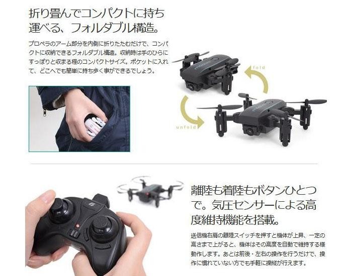 | 気圧センサーの搭載により高度を自動補正、入門者でも簡単にフライトできます。720pのWi-Fi HDカメラを搭載し、スマホでライブ映像や写真・ムービーの撮影が可能。カメラは最大90度まで角度を調整でき、真下に向けての高い位置から見下ろすように撮影する、ダイナミックな撮影が可能になりました。 |