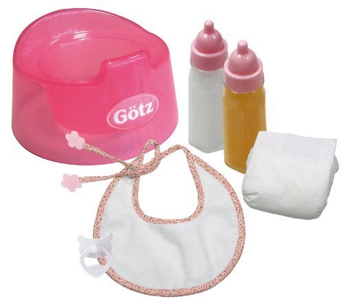-. Feature : This basic care set includes pink seat/potty, bib, two bottles, a pacifier and a diaper. Potty chair measured approx 9" in diameter and is great for all sizes of dolls! / Teaches important baby nurturing, feeding, potty skills to engage a child's parental instincts. A great incentive for potty training! Recommended for ages 3 and up. / Please note: the pacifier included fits gotz 13" baby dolls such as Muffin, Aquini and Cosy Aquini. It does not fit 16.5" gotz dolls.