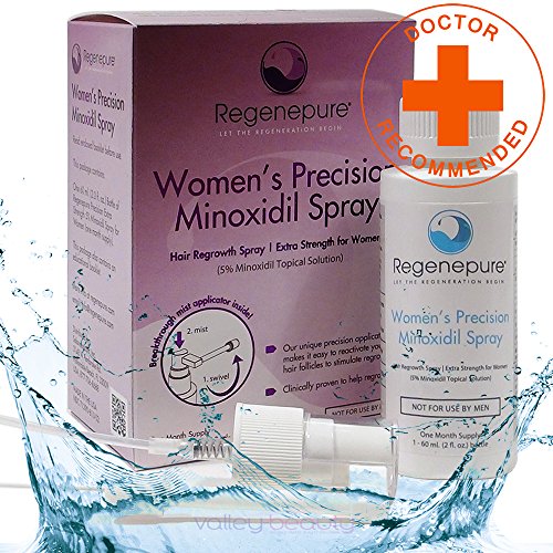 -. Feature : FOR WOMEN: Regenepure Precision 5% .M.i.n.o.x.i.d.i.l. Spray is specially designed to precisely treat hair loss in women. The fine mist applicator ensures a clean and targeted application of .M.i.n.o.x.i.d.i.l. without any cleanup. / SUPPORTS HAIR GROWTH: The fine mist applicator ensures absolute accuracy, targeting problem areas with ease. The direct contact spray will also help provide the scalp with the oxygen and nutrients it needs to stimulate healthy hair growth and regrowth. / HOW IT WORKS: When applied twice a day, .M.i.n.o.x.i.d.i.l. is able to re-awaken and re-energize the dormant, atrophied hair follicles thus producing new hair growth where there was none and promotes thicker strands where the hair strands are thinner and weaker. / WHAT YOU GET: Each box contains a one month supply of Precision 5% .M.i.n.o.x.i.d.i.l. Spray in an easy to store 2 fluid ounce (60ml) container. / THE REGENEPURE LINE: Regenepure Precision 5% .M.i.n.o.x.i.d.i.l. Spray works best when used in conjunction with the Regenepure DR Hair Loss Shampoo, as the shampoo will help cleanse and detoxify hair follicles; allowing for optimal .M.i.n.o.x.i.d.i.l. absorption.