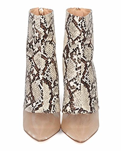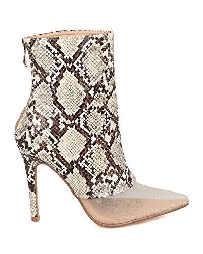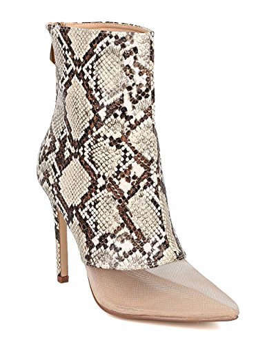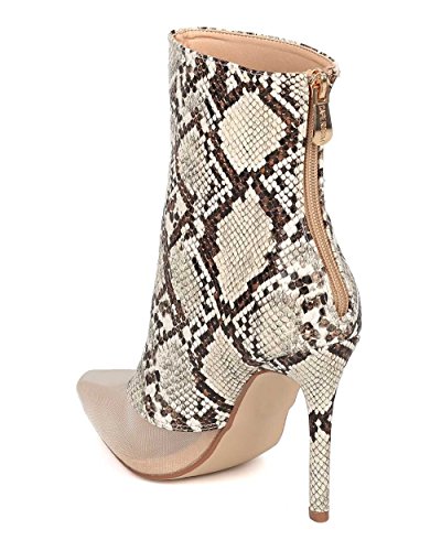Product Description These snakeskin leatherette booties are made with a pointy toe, mesh front panel and single sole. Also made with a stiletto heel and hind zip for easy slip on and off. 0