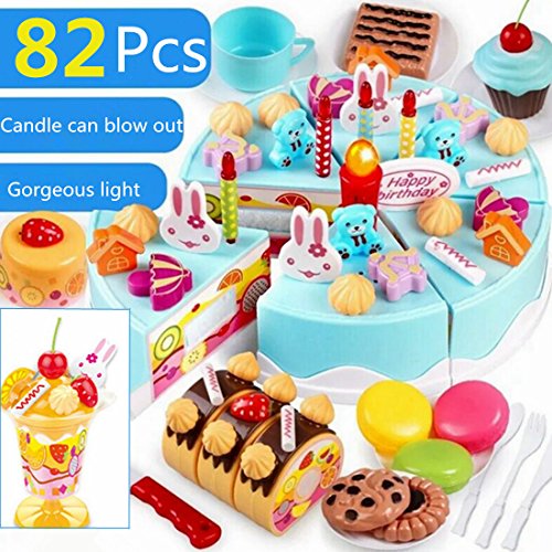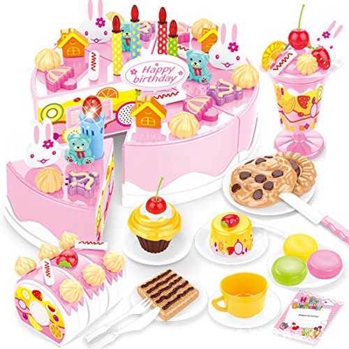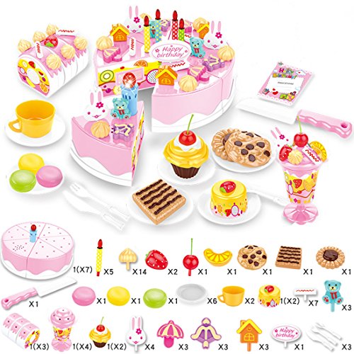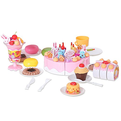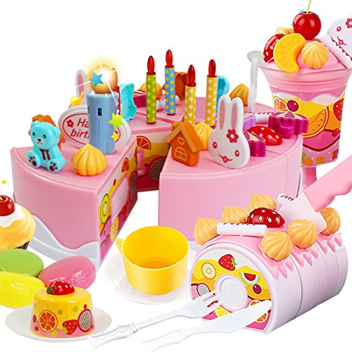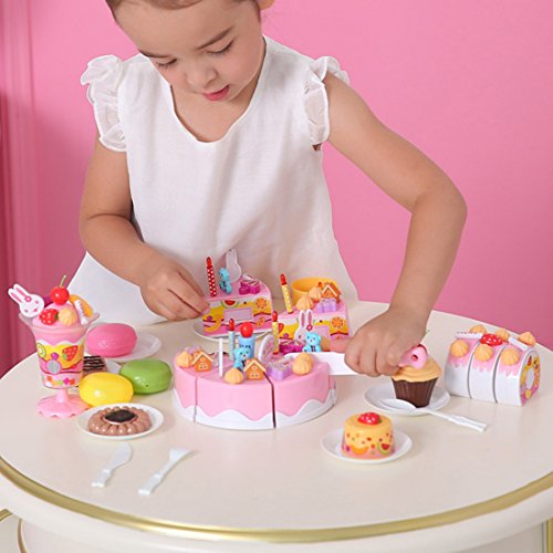 RAVPump 82Pcs Birthday Cake Pretend Play Food Toy Set for Children Early Development and Education (Main Pink)