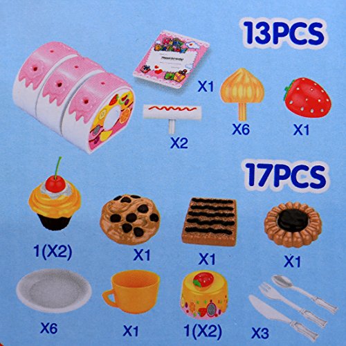 .PACKAGE LIST: Totally 82 pieces, 1 x Whole Cake(6 Pcs); 1 x Fruits Omelette(3 Pcs); 1 x Pudding; 1 x Cup; 2 x Cookie; 1 x Birthday Card; 3 x Macarons; 1 x Small Cake; 1 x Square Cookie; 6 x Plate; 1 x Fork; 1 x Spoon; 5 x Candle; 1 x Knife; 1 x Cake Knife; 1 x Greeting Card; Decorations (47 Pcs).