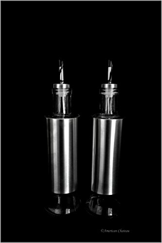 -. Feature : Oil & Vinegar Cruet Set / Glass Drizzlers with Stainless Steel Sleeves / Plastic Pourers / 9 oz Capacity / 8"H x 3.25" Diameter