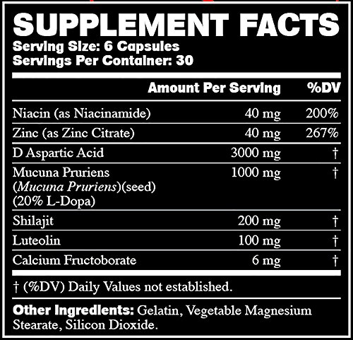 SCIENTIFICALLY SUPPORTED ALL-STAR STACK OF INGREDIENTS THAT ACTUALLY WORK: Shilajit, D Aspartic Acid, Mucuna Pruriens (L-dopa), Luteolin, Calcium Fructoborate, Niacin, and Zinc are well researched and documented ingredients that deliver real results! Put the power of our exacting formula to work in your body and experience increased energy, stamina, focus, endurance, and drive.