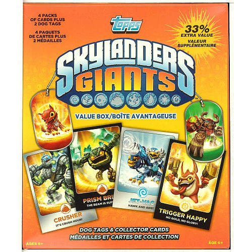 -. Feature : Skylanders Trading Cards Value Box Each Value Box contains four (4) packs of Skylanders Trading Cards (each pack contains five (5) '12 Topps Skylander Base Trading Cards + one (1) Insert Card - either Rainbow Foil Giant or Mirror Foil Character Card) and two packs of Skylanders Dog Tags.