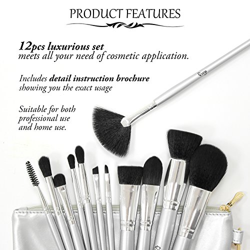 COME WITH PORTABLE BAG &NICE BROCHURE:12pcs cosmetic brushes has PU leather cosmetic bag (size:8.66 * 5.11 inches) for brushes or various cosmetic, is perfect for traveling and taking them to anywhere. A cute brochure showing you the specific usage of each brushes, perfect for makup starters.