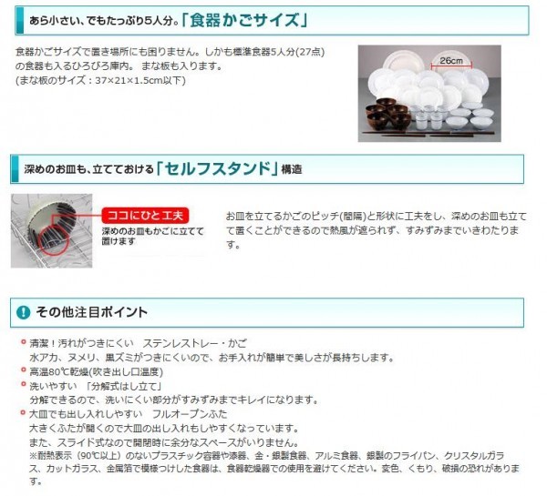 | 仕様 | 消費電力:290W 電源:交流100V・50/60Hz 電源コード:1.8m 食器容量:5人分 ふた開閉時最大高さ:39.5cm |