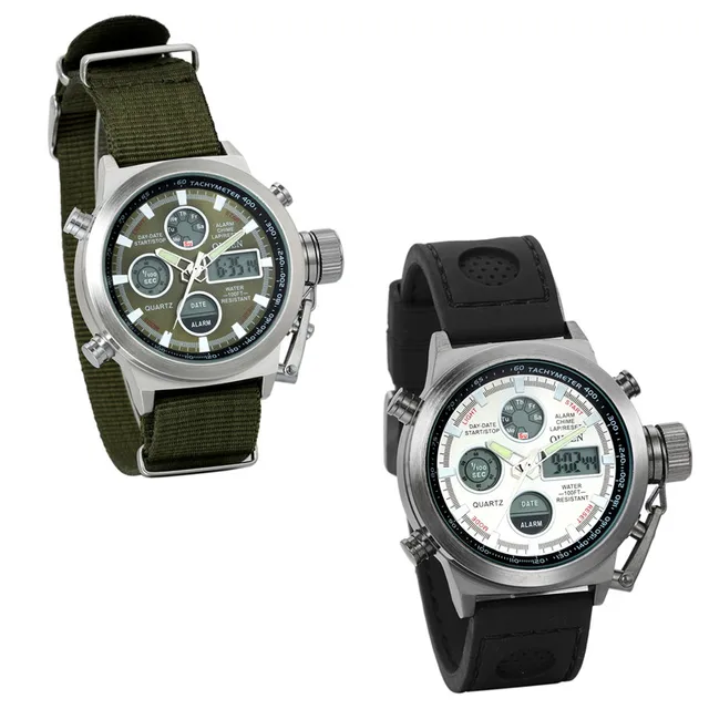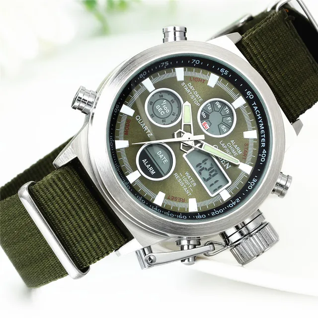 상품 내용 전체 브랜드: Lancardo -시계 카테고리:남성 -특징: 디지털 시계, 실리콘 시계; 주도 시계 듀얼 디스플레이 아날로그 다이얼 운동 유형: 디지털/석영 디스플레이 유형: 그림 + 포인터 다이얼 색상: 실버 + 녹색 밴드 밴드 materal: 실리콘/나일론 -버클 유형: 핀 버클 밴드 색상:블랙/그린 무게 -시계 길이입니다: 26.5 센치메터 다이얼 직경: 약 4.4 센치메터 다이얼 두께: 약 1.7 센치메터 밴드 폭: 약 2.2 센치메터 -시계 무게: 약 99 그램 Lancardo 남성 스포츠 시계 군사 디지털 시계 듀얼 디스플레이 아날로그 석영 시계 브랜드 남성 30 메터 방수 손목 시계