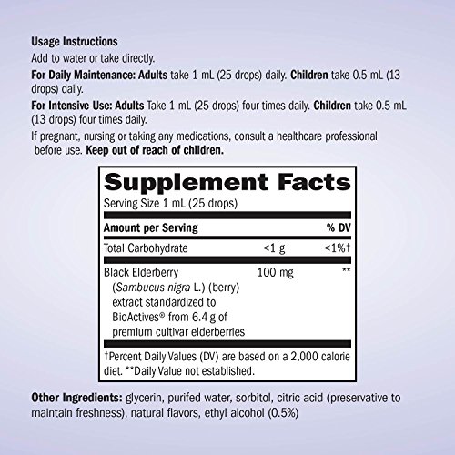 -. Feature : Sambucus Ultra-Strength Elderberry made with unique, full-spectrum black elderberry extract, ten times more elderberry per mL than our elderberry syrups, gluten-free, Kosher, no added sugar and vegetarian / 1 mL delivers 100 mg of extract derived from 6,400 mg of fresh black elderberries, from unique cultivar black elderberries with higher levels of naturally occurring flavonoids / Solvent-free extract standardized to flavonoids (anthocyanins) / Extract tested for bioavailability and activity within the body / Add to water or take directly