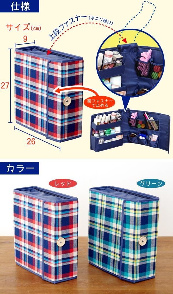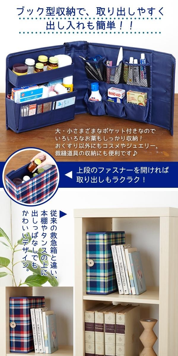 | 細かい物から箱物などサイズがマチマチで散らかりがちな救急箱。大小さまざまなポケットを設けることですっきりと整理整頓できるよう工夫しました!ブック型収納で、取出しやすく出し入れも楽々!お薬以外にもコスメやジュエリー、裁縫道具の収納にも便利です★ |