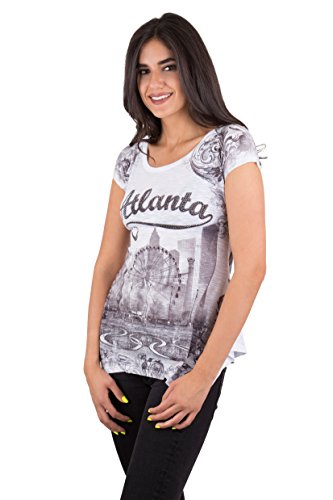 -. Feature : Celebrate the fun of the ATL with this Atlanta t-shirt / The pretty scoop neck of this tee makes it a great option for everyday wear, while the swingy casual fit is perfect for wearing with shorts or jeans in warmer weather / Features the beautiful ferris wheel from the Atlanta fair, the city skyline and beautiful scroll design / Crafted in a lightweight 100% polyester material for easy, comfortable wear all year long. / Simply machine wash this shirt with like colors when ready.