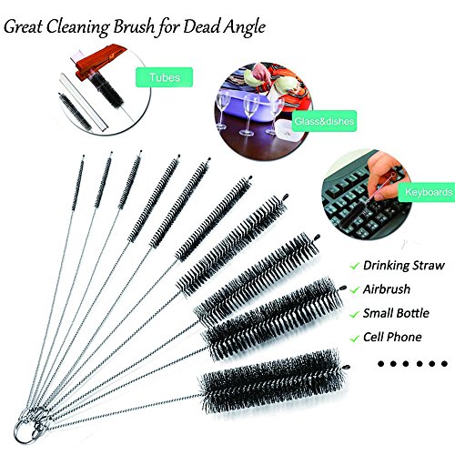 - CUSTOMIZED BLIND ANGLE CLEANING BRUSHES: 10 pieces cleaning tube brushes with different diameter from 1/16 to 1 inch. Perfect for hard to reach areas, such as Gun, Pistol, Drinking Straw, Airbrush, Small Bottle, Cell Phone, Drip Tip, Colander, Eye Glass, Jewelry, etc