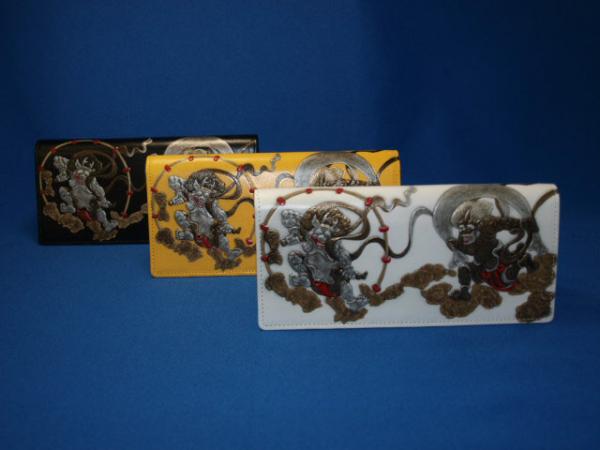 | 人気の「風神雷神」の絵柄浮き押し加工を施した高級牛革財布です。高級牛革の上と下側に版をあてがい、熱と圧力を掛けて革に膨らみの癖を付け、徐々に冷まして革に凹凸を付けます。その上から色を付けていくという、大変熟練された技術の要る作業を、手間暇を惜しまず仕上げた、職人魂の逸品です。 |