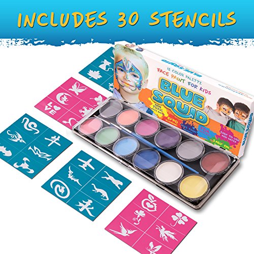 Blue Squid Face Paint 12 Color Palette | 30 Stencils, 3 Brushes, Jumbo Size Sturdy Case | Professional Best Quality Painting Kit for Kids | Water Based Set Non-Toxic FDA Approved | +Online Guide