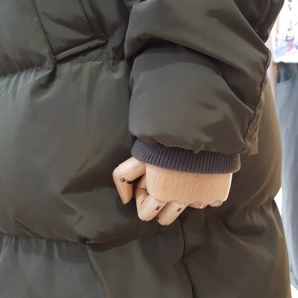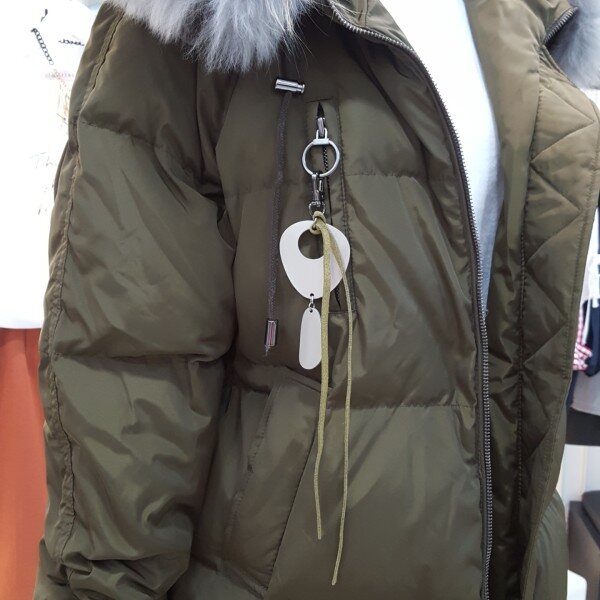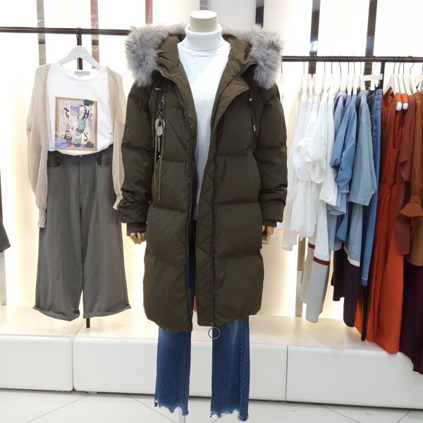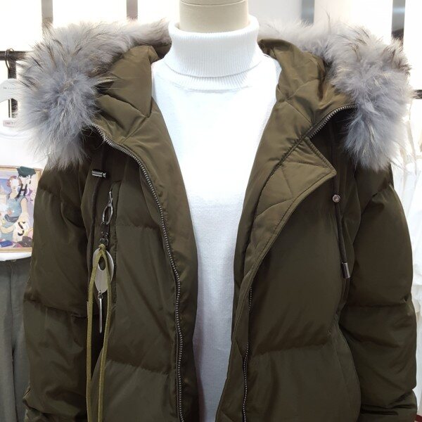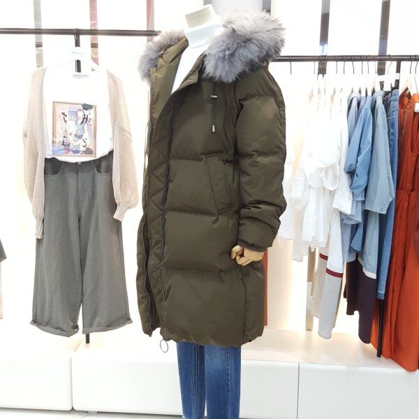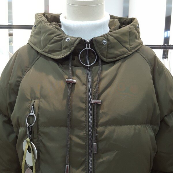 스킨라쿤퍼의 연출로 스타일리쉬하며 가슴부분 실버링장식이 심플한 포인트를주는 디자인의 다운점퍼입니다.