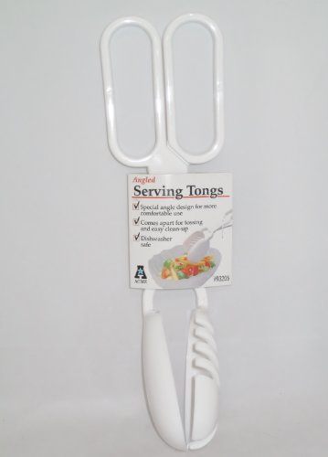 Product Description Acme Angled White Serving Tongs, offset design to make it easier to serve salad or pasta, white plastic, dishwasher safe, comes apart for easy cleaning, made in China, Free Shipping in USA. 0