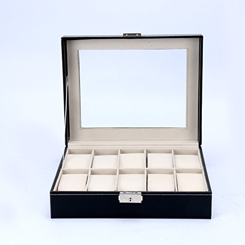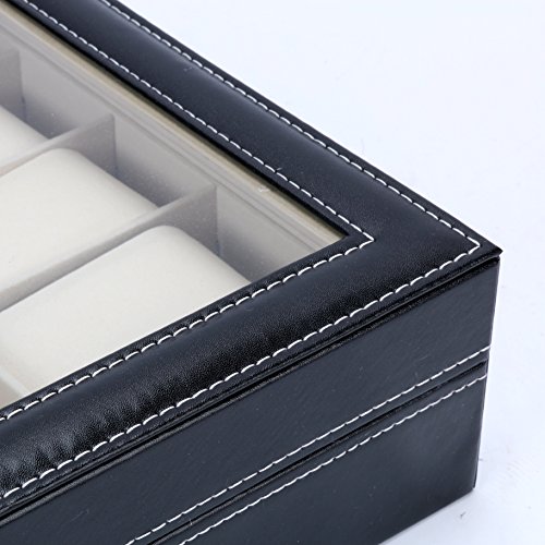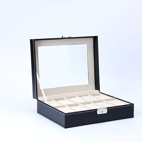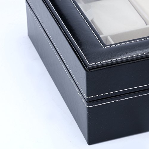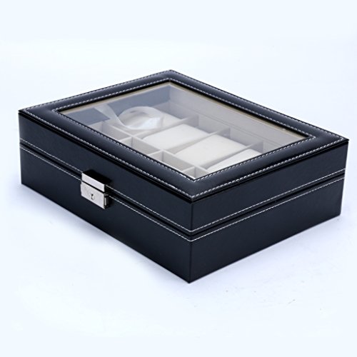 Watch Box 10 Slots Men Black PU Leather Display Clear Top Jewelry Case Organizer