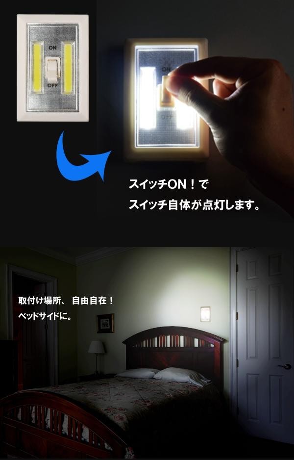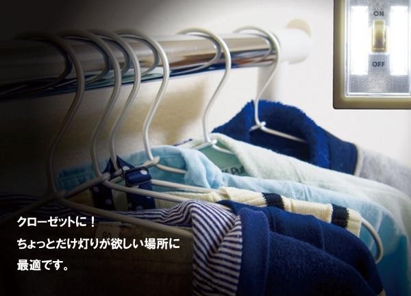 | スイッチを入れるとスイッチ自体が点灯する楽しいライトです。平面型COB-LEDライト、84~86ルーメン(約1ワット)の明るさ!クローゼットや寝室、押し入れや物置におすすめです。 |