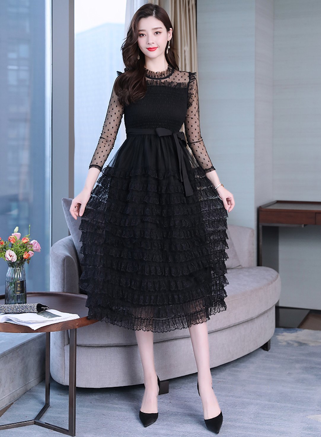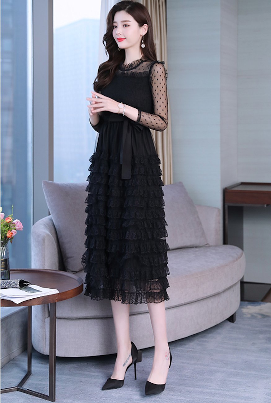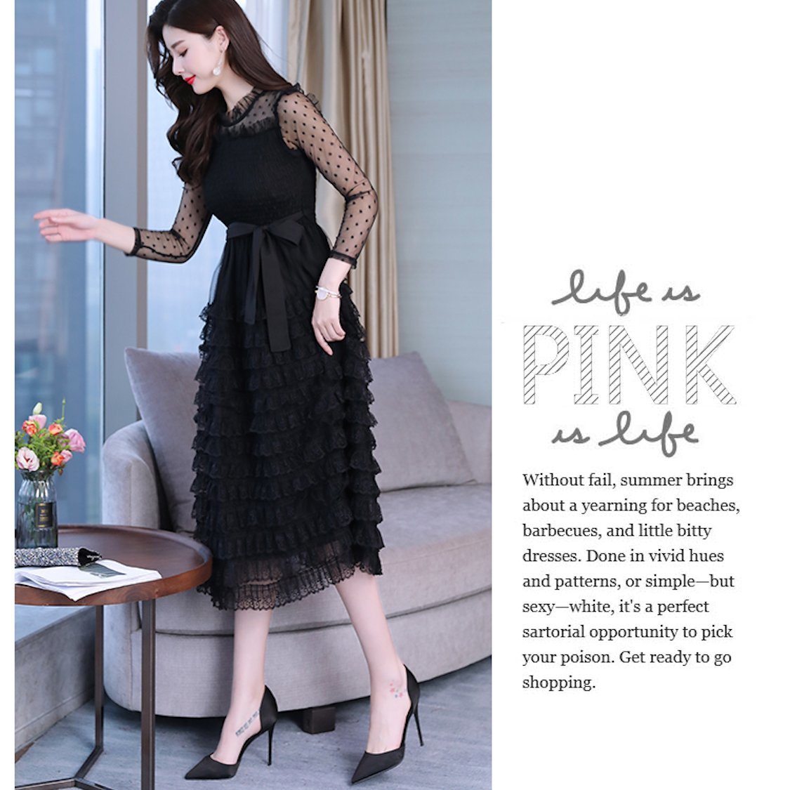 ドット柄 シースルー ウエストリボン フリンジ装飾 ミモレ丈 ワンピース ドレス 透け感 フレア 結婚式 パーティー お呼ばれ フェミニン