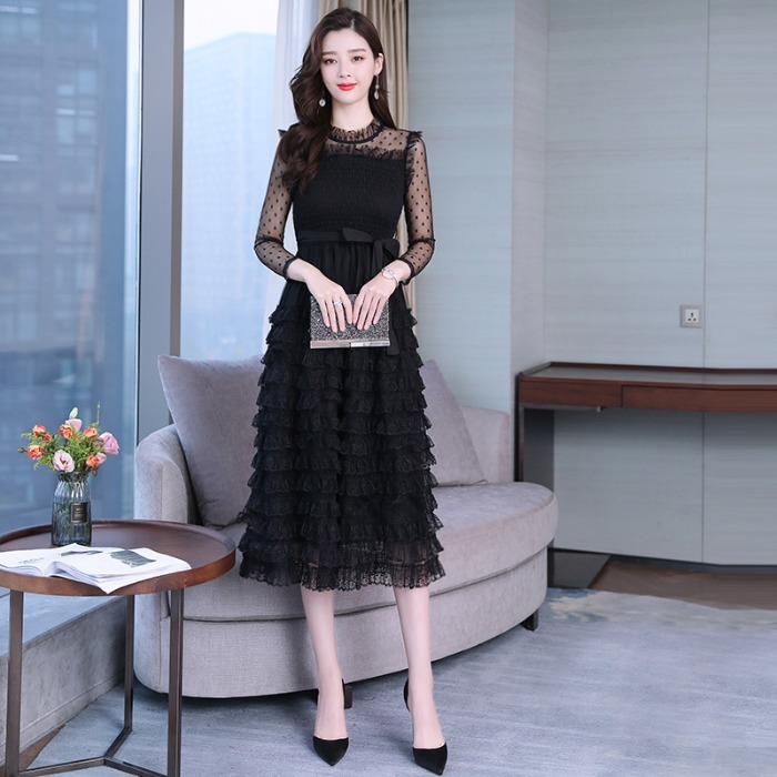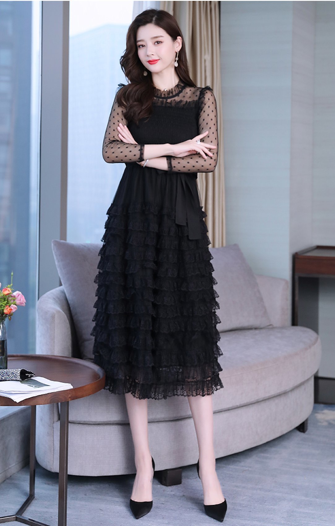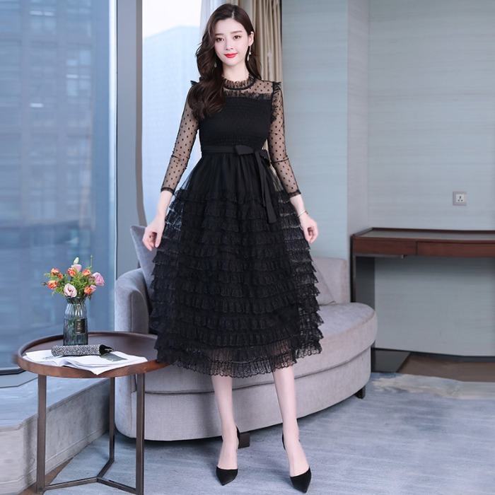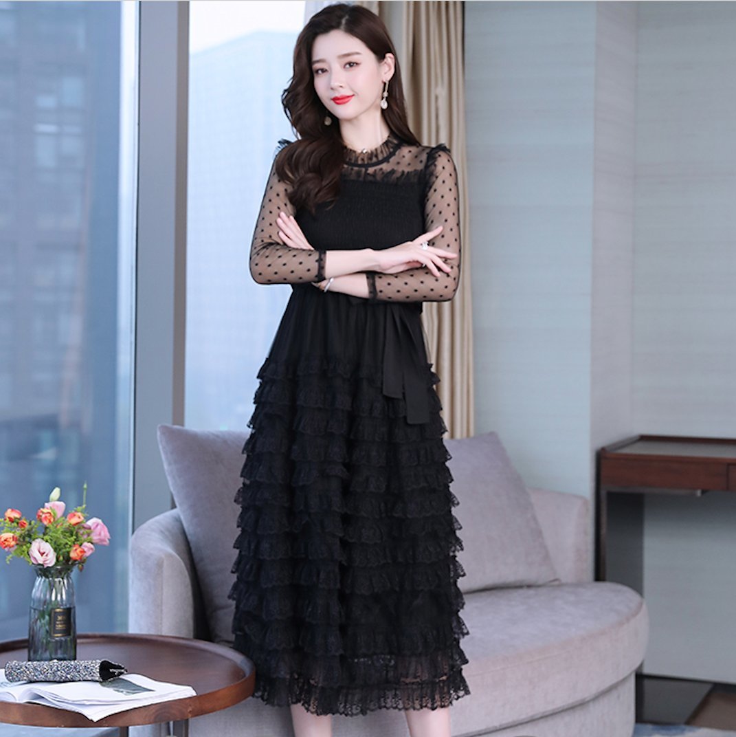 ドット柄 シースルー ウエストリボン フリンジ装飾 ミモレ丈 ワンピース ドレス 透け感 フレア 結婚式 パーティー お呼ばれ フェミニン