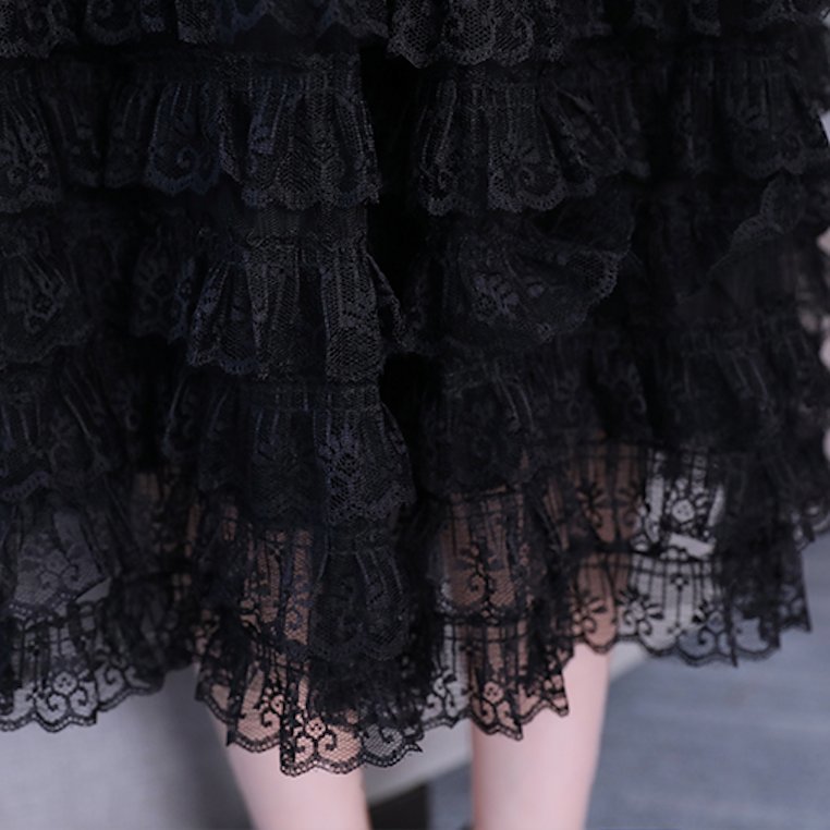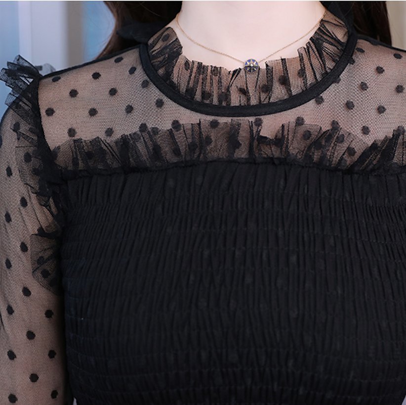 胸元から袖口までのドット柄シースルーが大人フェミニンな印象に◎