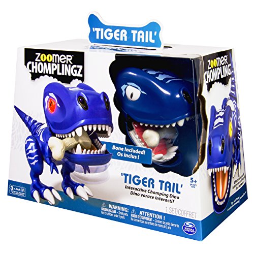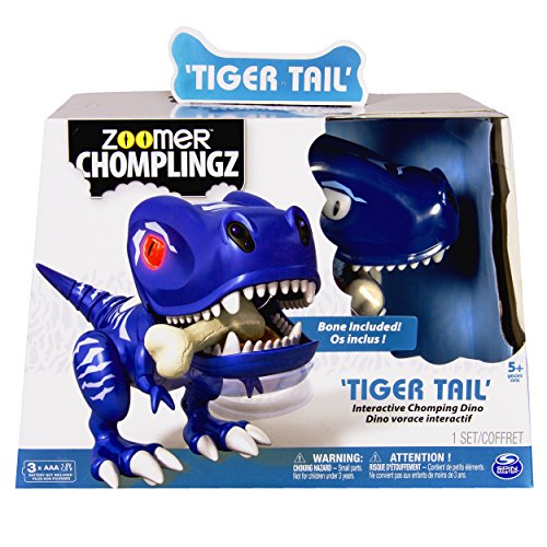 Tiger Tail is the troublemaking and game playing species of Zoomer Chomplingz who’s full of bite! He loves a good roar and is always on the prowl, sniffing out adventure! This ‘lil mischief-maker is packed full of interactive games to play. His advanced mouth and nose sensors let him sense where you are. Try your hand at a round of Sound Warp, Hot Hands or a bone-chomping game of catch! Just toss his Bone Accessory into his mouth and watch him bite down and catch it. But watch out! It’s not always fun and games; if you pull his tail, Tiger Tail will let out a dino sized fart!. Remember, he’s full of bite! Use it to your advantage as you set him up in guard mode to watch over your room. He’s a loyal ‘chompanion’ who will growl if anyone tries to touch what he’s protecting. Push, play and chomp with Tiger Tail as you get into mischief with his teeth chomping action. Discover Tiger Tail and Chomplingz fun you can sink your teeth into! Zoomer Chomplingz -- Full of life – full of bite!