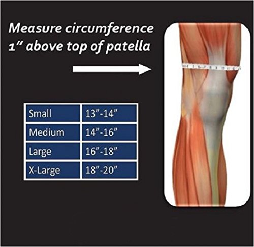 -. Feature : Thick gel provides comfortable stabilization to the knee, and absorption of dynamic forces. / 4way stretch material provides supportive compression while allowing full range of motion. / Light, breathable fabric keeps skin dry reducing any fabric irritation. / Medial and lateral sP.R.Ial stays provide knee joint stability. / Measure size using the circumference of the knee 1 inch above top of patella. Small (13" - 14"), Medium (14" - 16"), Large (16" - 18"), Xlarge (18" - 20") / Sizing Chart: Item 7200 Small (13" - 14") Item 7201 Medium (14" - 16") Item 7202 Large (16" - 18") Item 7203 Xlarge (18" - 20") (Circumference measured 1" above top of patella)